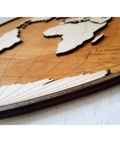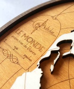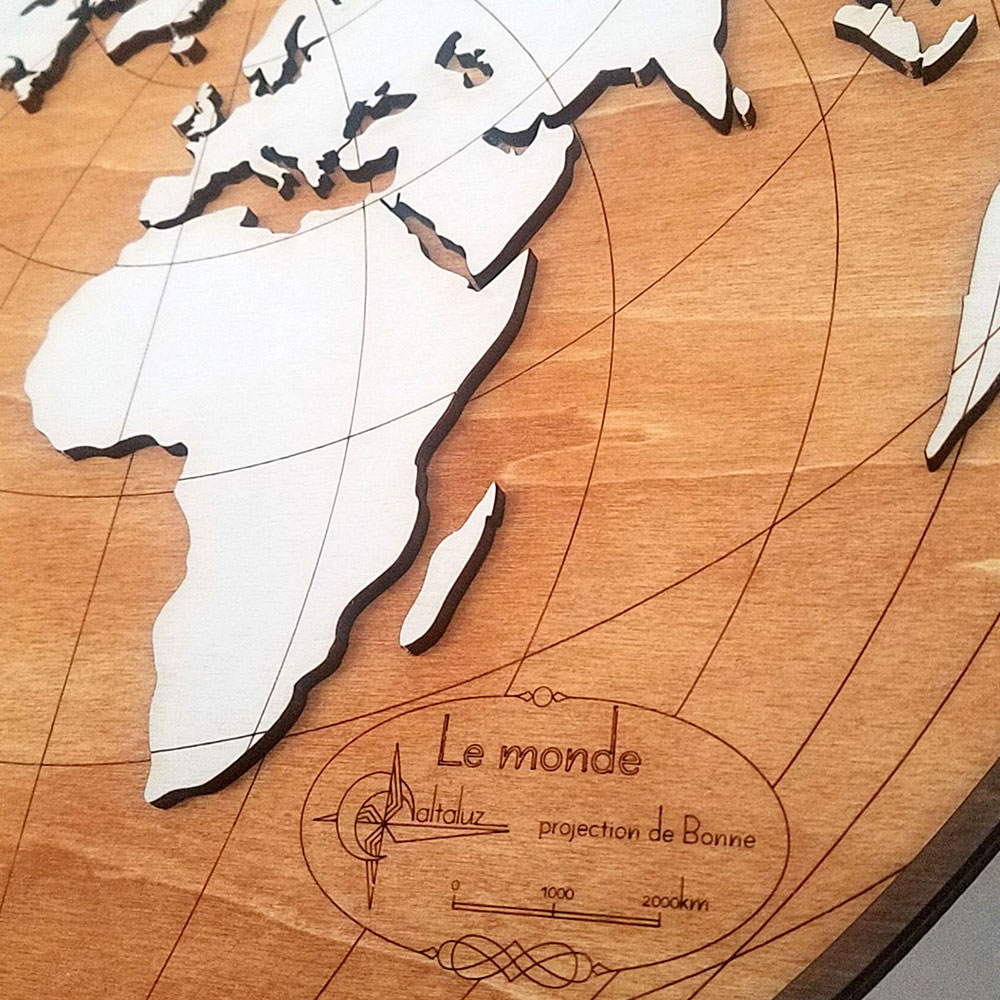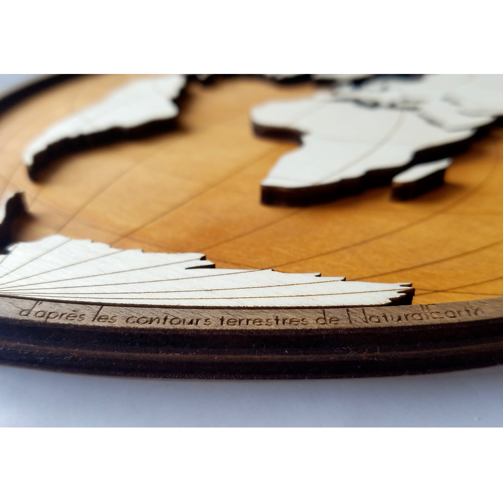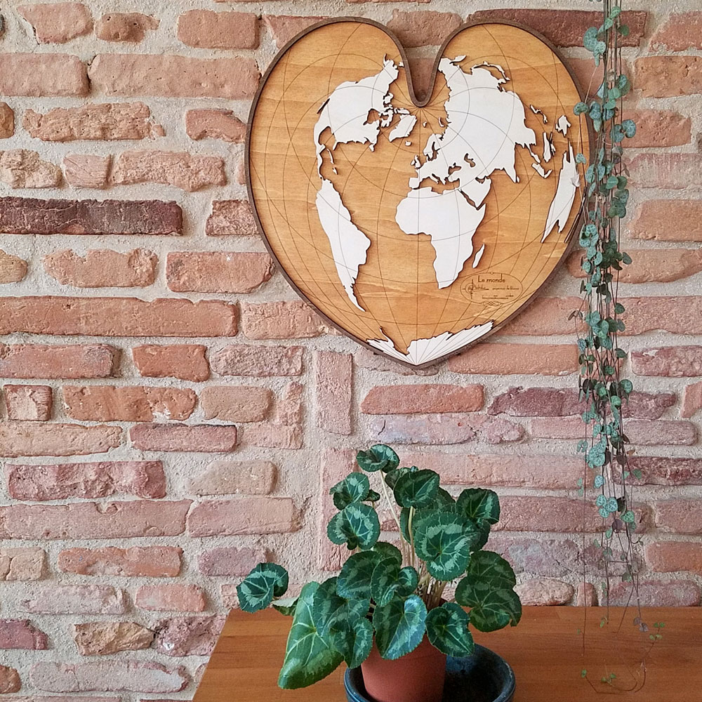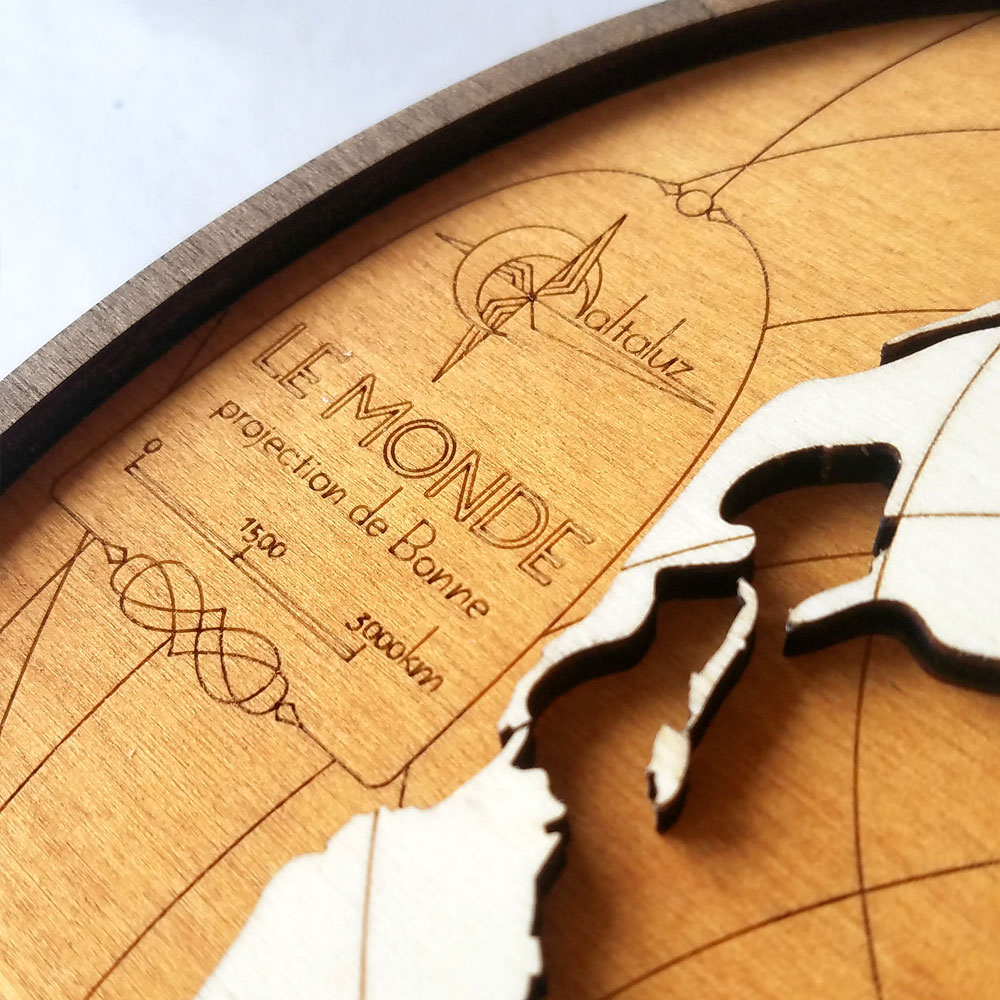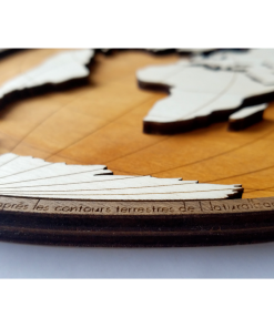 Cette carte est composée de deux plaques de bois de 5mm finement découpées, gravées et superposées. Sa forme est liée à la projection cartographique utilisée (projection cordiforme de Bonne). L’aspect 3d de cette mappemonde et le contraste entre les différentes teintes de bois font de cette décoration un objet unique.